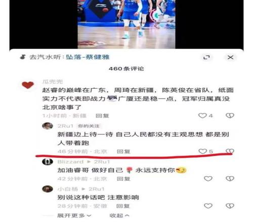 有不少网友还在赵睿的社交平台上留言,面对属地为IP地址为新疆的球迷留言称:北京争冠无望,而赵睿直接回复:“新疆边上待一待,自己人民都没有主观思想,都是别人带着跑。”另外一名新疆球迷提到他罚球不中,赵睿更是回怼:“回去打馕去”。