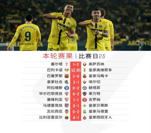 随着今日凌晨比利亚雷亚尔4比1大胜西班牙人,除开巴列卡诺对阵皇家奥维耶多的比赛延期外,西甲第23轮的其余九场比赛全部战罢。积分榜方面,巴塞罗那、皇家马德里双双取胜,前者仍然以1分优势领跑西甲联赛;马竞本轮0比1不敌皇家贝蒂斯,尽管多赛一场,但积分已被身后的比利亚雷亚尔追平,皇家贝蒂斯则紧随其后、位列欧联区。